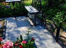 Далее мы покрыли участок бетонной плиткой, предварительно установив столик и лавочку.
